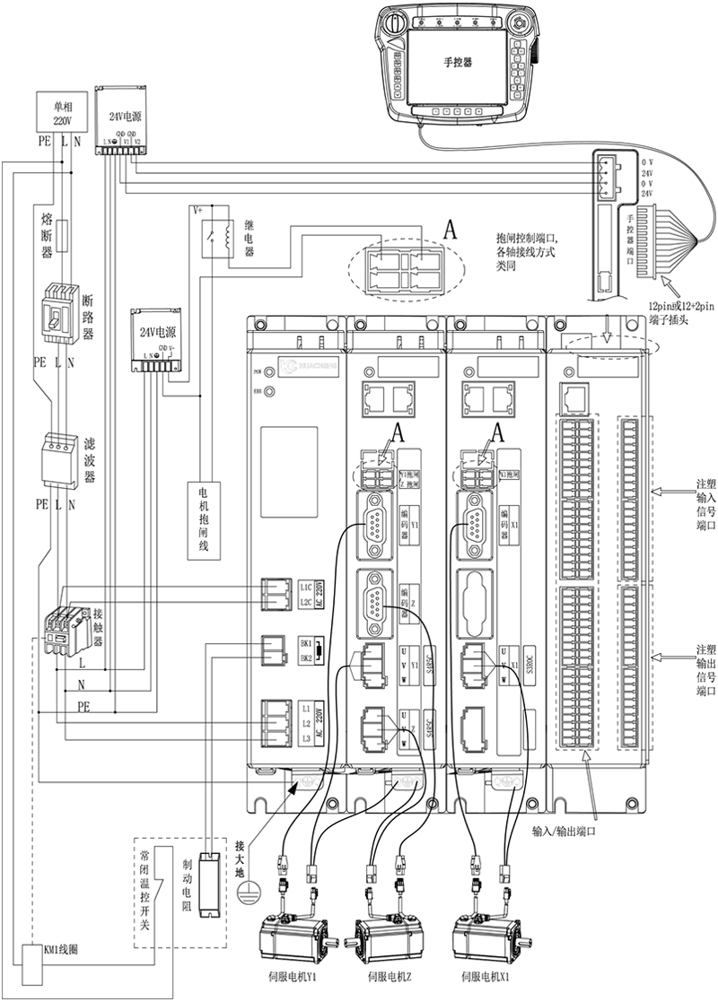 三轴注塑驱控一体化机械手控制系统-EC-S3,箱体整体外观接线说明: