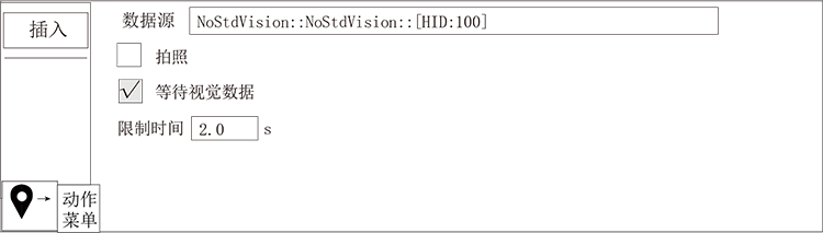 1、选择数据源,勾选拍照,根据情况选择某个输出点,设置其动作时间,输出次数及间隔时间,表示某个输出点有输出后拍照多少秒,间隔多久后再拍照,共拍照几次,插入到主程序中后再进入视觉指令页面勾选等待视觉数据设置限制时间,表示拍照不成功没有数据反馈后等待多久报警。例如要让输出Y15时进行拍照2s,每间隔3s后输出一次Y15进行拍照,三次拍照后若等待2s没有拍照成功的数据反馈即报警,则参数设置如下所示: