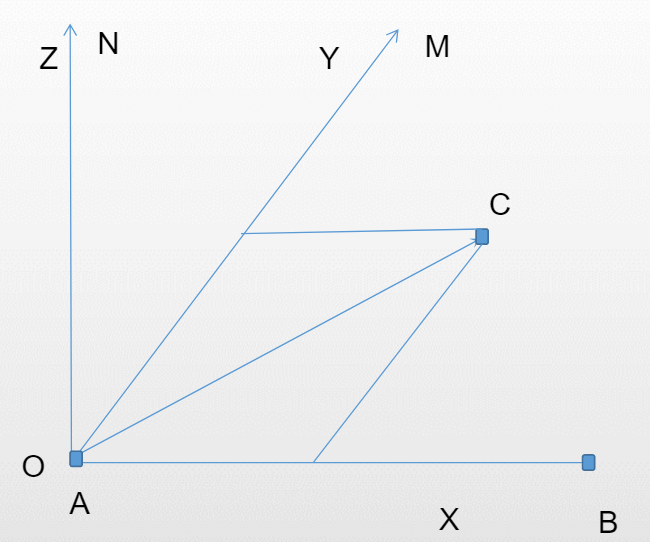 • 以A为原点,AB为X正向,AM为Y正向,AN为Z正向的坐标系就可以建立,这就是工作台坐标系。