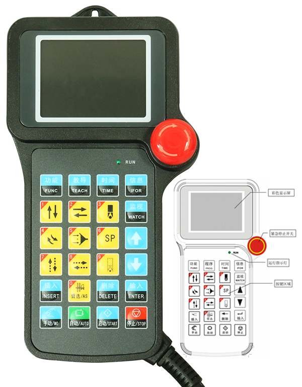 斜臂机械手应用系统为15vip太阳集团系列HC-X1斜臂机械手控制系统,手控器的操作面板按键介绍如下: