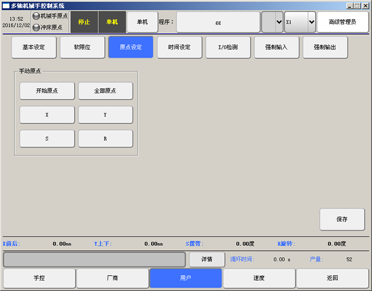 手动状态下按下急停按钮断掉伺服使能,手动移动各轴至原点位置然后再进入原点设定页面下先点击【开始原点】按钮再点【设为原点】按钮,待各轴坐标都显示为0后原点设置成功。