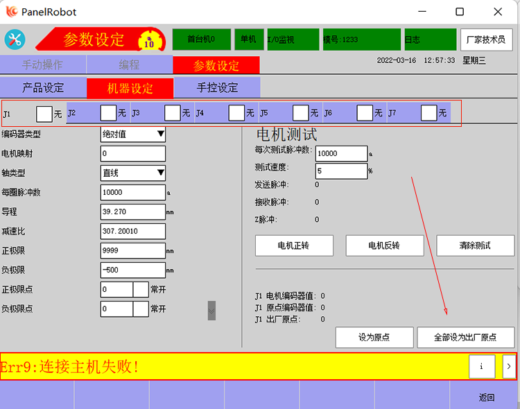 首先,工业机器人需要校准机械零位,先手动将机器人走到零位,对准刻度后,点击电机参数界面的全部设为原点。
