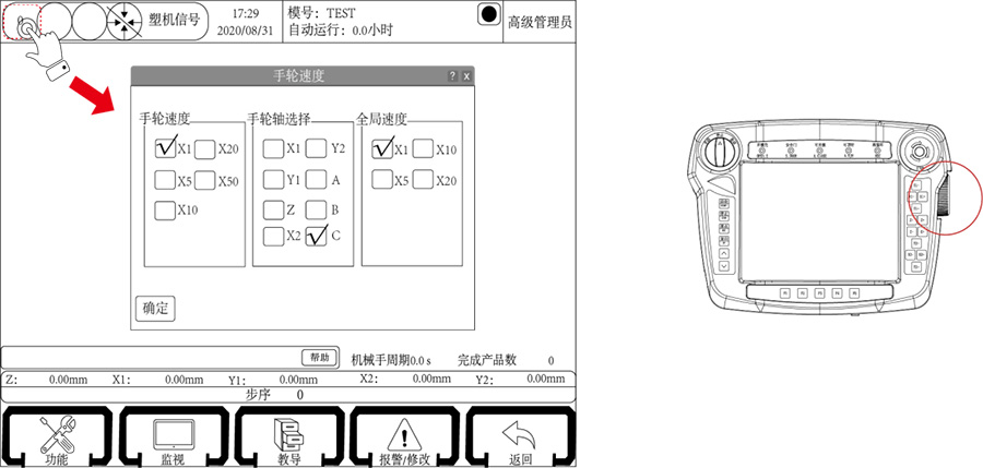 操作方法:单击界面右上角“圆点”按钮,单击勾选“手轮选择”选项,选择手轮速度、选择需要微调的轴或者按一下需要微调的轴按键(手控器上)然后滚动微调旋钮即可使轴一点一点移动至目标点。